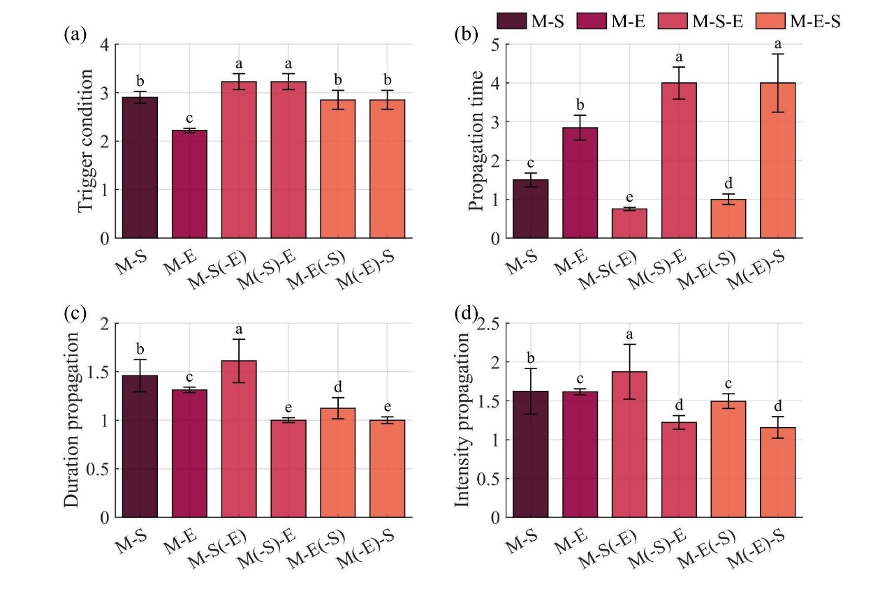 图1 干旱沿不同路径从气象干旱(M)到土壤干旱(S)和生态干旱(E)的传递特征