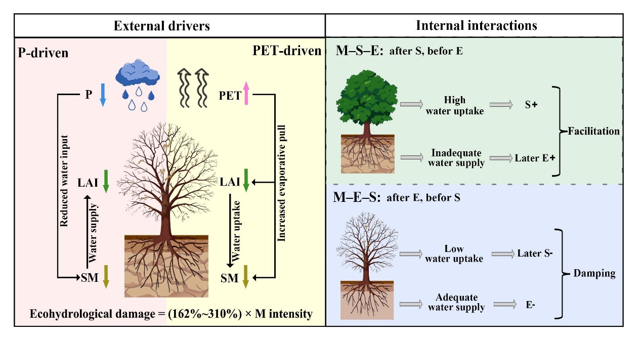 气象干旱可以传递到土壤干旱和生态干旱,导致土壤水分锐减和植被绿度下降,从而扩大生态系统受干旱影响的范围,并引发一系列级联性的功能退化。然而,“气象—土壤—生态”干旱的传递过程是否存在非线性放大效应,从而增加生态系统在干旱期间所遭受的损失,尚缺乏系统性定量评估。这极大地削弱了对灾难性干旱级联事件的预警与防控能力。