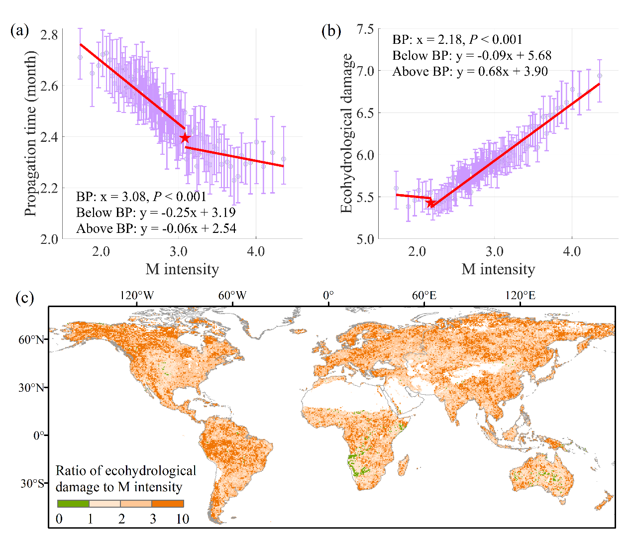 研究发现,干旱可以沿多种路径从气象干旱(M)传递至土壤干旱(S)和生态干旱(E),包括M–S、M–E、M–S–E和M–E–S。在所有路径中,生态水文损失均被放大,达到了初始气象干旱强度的162%—310%(图1)。这种放大效应通过土壤干旱与生态干旱持续时间的延长以及峰值强度的加剧得以实现。特别的是,当气象干旱强度超过3.08的标准化阈值后,干旱传递时间骤减;当气象干旱强度超过2.18的标准化阈值后,生态水文损失骤增。在全球,干旱传递放大了99%的被影响地区的生态水文损失,其中77%地区的生态水文损失超过了初始气象干旱强度的2倍,30%地区的生态水文损失超过了初始气象干旱强度的3倍(图2)。